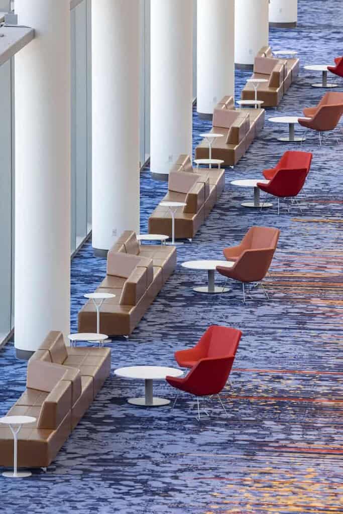 Interior designers approach convention center concourses with a focus on longevity, durability, and adaptability. Open and inviting common spaces are now the standard, with flexible seating arrangements with easily accessible power, interactive digital displays, and access to the outdoors. All allowing attendees to engage in both formal and informal discussions. Designers also prioritize intuitive wayfinding, ensuring seamless movement between sessions and events.